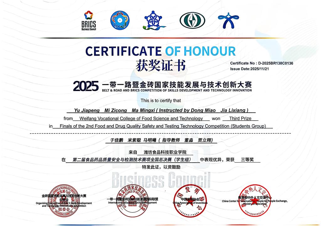 近日,2025一带一路暨金砖国家技能发展与技术创新大赛第二届食品药品质量安全与检测技术赛项全国总决赛圆满落幕。我校参赛团队凭借扎实的专业功底、娴熟的实践技能和出色的临场应变能力,在众多参赛队伍中脱颖而出,最终斩获全国总决赛三等奖1项、优秀奖2项,充分展现了我校在食品药品质量安全与检测技术领域的人才培养成效。