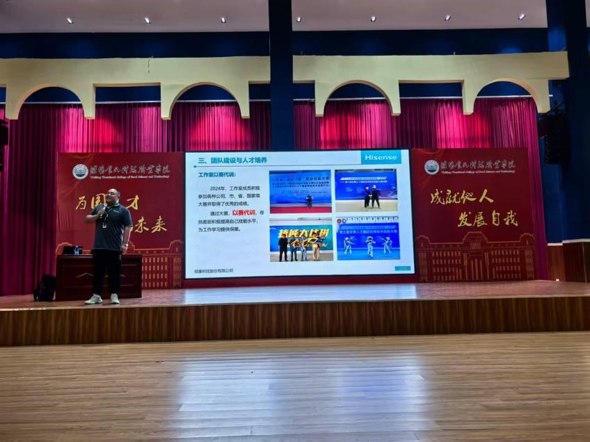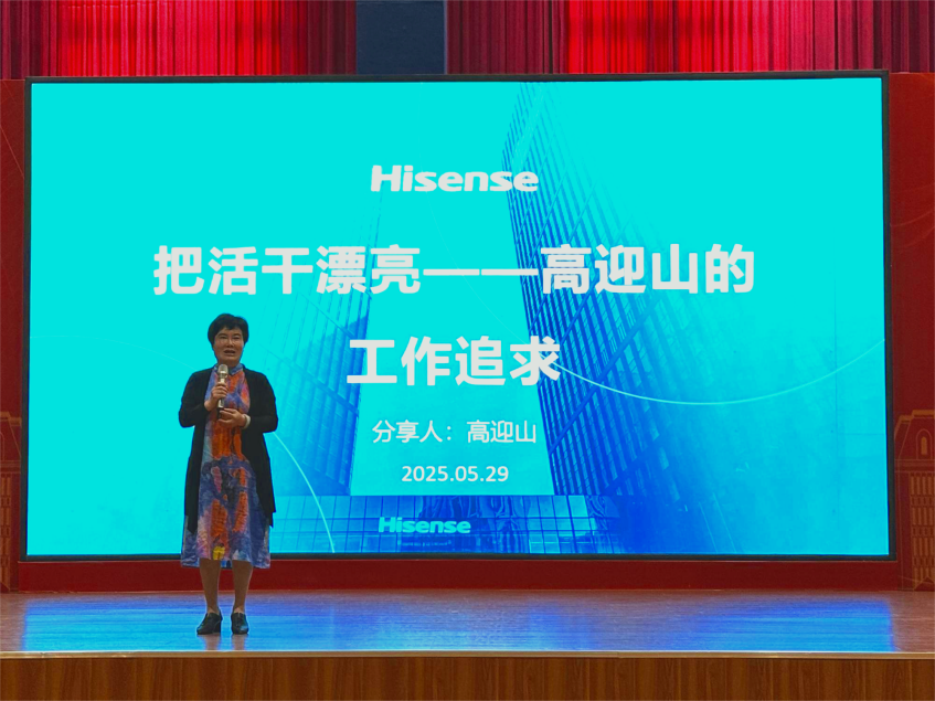 讲座伊始,高迎山以“从车间学徒到首席技师”为主线,用平实生动的语言讲述了自己二十余年如一日的技能深耕之路。从初入海信时面对精密仪器的手足无措,到通过数万次实操练就“听声辨障”的绝活;从参与重点研发项目的技术攻坚,到带领团队突破行业技术封锁……他以一个个鲜活的故事,将“执着专注、精益求精、追求卓越”的工匠精神具象化。“所谓技能,没有捷径可走,就是把简单的事重复千遍做到极致。”这句朴实无华的总结,引发在场学子强烈共鸣。