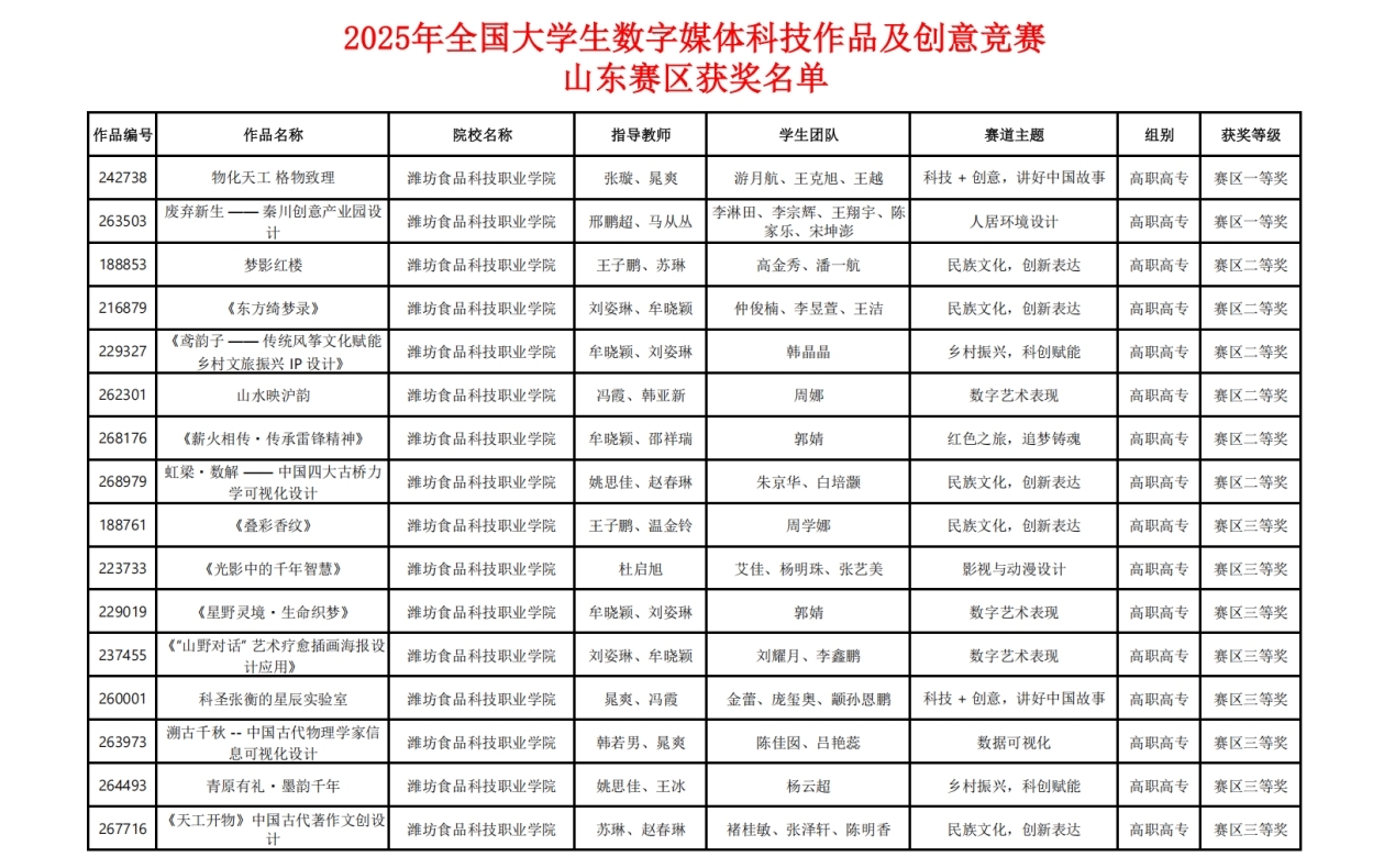 10月14日,2025年全国大学生数字媒体科技作品及创意竞赛各赛区评审结果正式公布。我校艺术传媒学院学子凭借扎实的专业能力与出色的创新思维,在山东赛区竞争中脱颖而出,共斩获一等奖2项、二等奖6项、三等奖8项,获奖成果覆盖九大赛道,充分彰显了我校在数字媒体技术与艺术跨界融合领域的教学实力与人才培养优势。