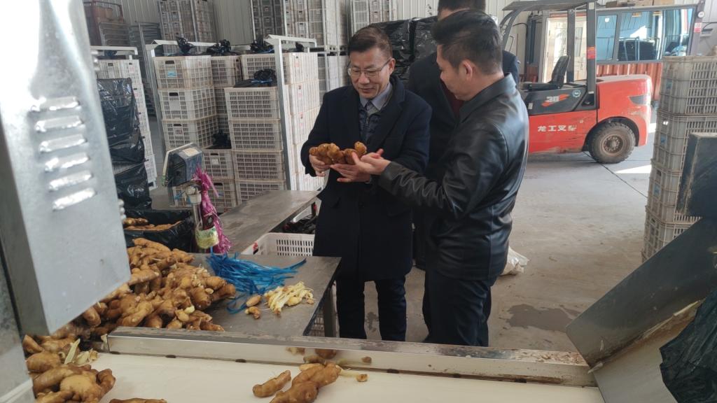 在山东斧创产业发展有限公司总经理赵永刚、人事主任刘小兵的陪同下,郭宗明一行先后实地参观了企业种植基地、综合加工区、仓储库及研发中心。赵永刚详细介绍了大姜无土栽培技术应用、产品深加工流程、专业贮藏条件等核心业务板块,让考察组对企业的生产运营、技术优势和发展规划有了全面直观的了解。