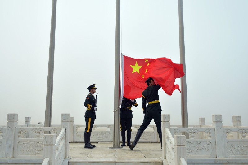在雄壮的国歌声中,鲜艳的五星红旗冉冉升起,全体干部师生庄严肃立,满怀对祖国的无尽热爱,向五星红旗行注目礼,共同迎接新学期的开始。
