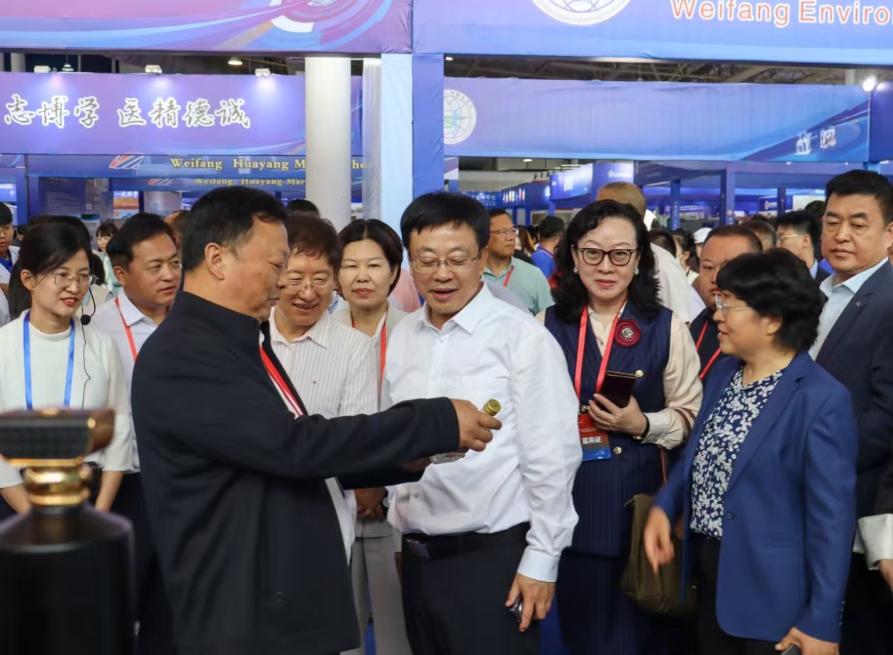 (山东省人大常委会副主任、省工商联主席、省总商会会长王随莲,潍坊市委书记刘运,副市长陈端梅等省市领导参观了我校职教成果展区,学校党委书记肖明胜介绍我校办学成果)