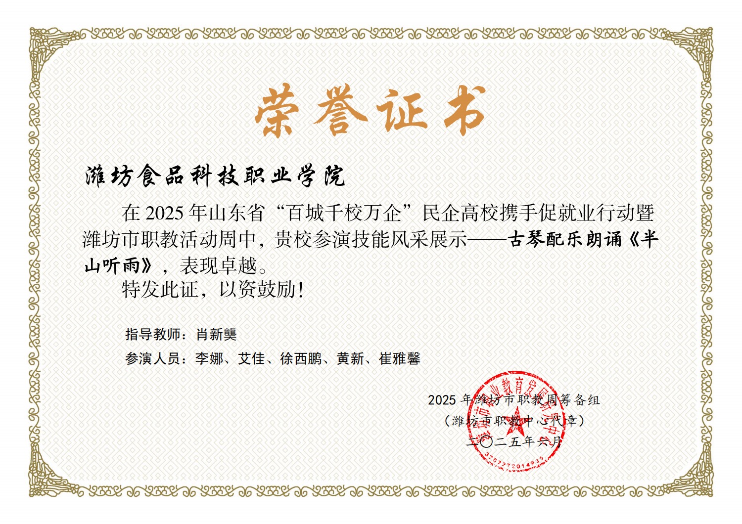 近日,在2025年山东省“百城千校万企”民企高校携手促就业行动暨潍坊市职教活动周期间,我校师生团队凭借精湛的文艺演出《半山听雨》——古琴配乐朗诵节目,荣获技能风采展示专项表彰。
