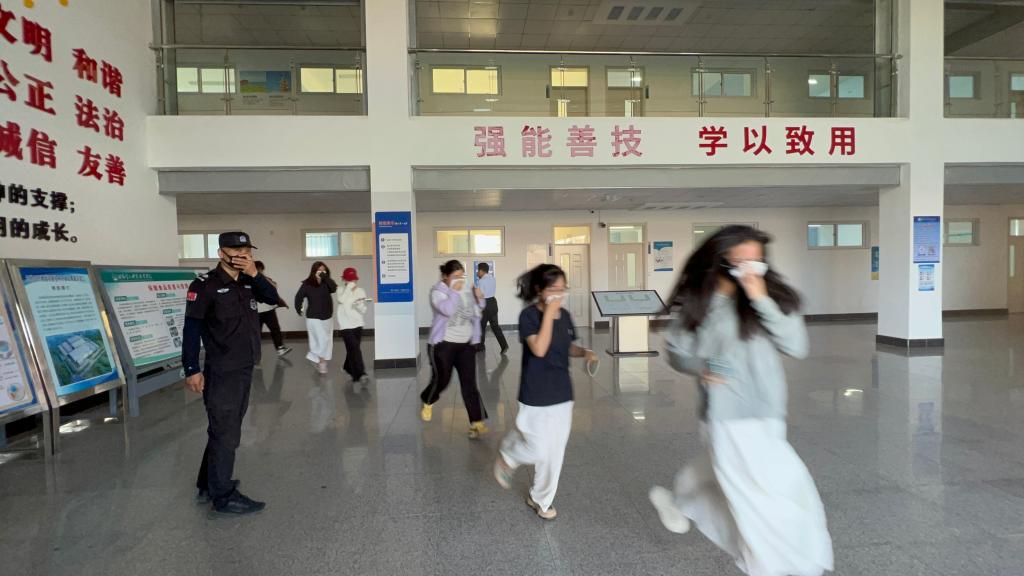 学生们严格遵循消防逃生要求,用湿毛巾等捂住口鼻,同时保持低姿态,沿着安全通道稳步有序地疏散。整个疏散过程紧张而有序,全体师生展现出了良好的应急反应速度和组织纪律性。