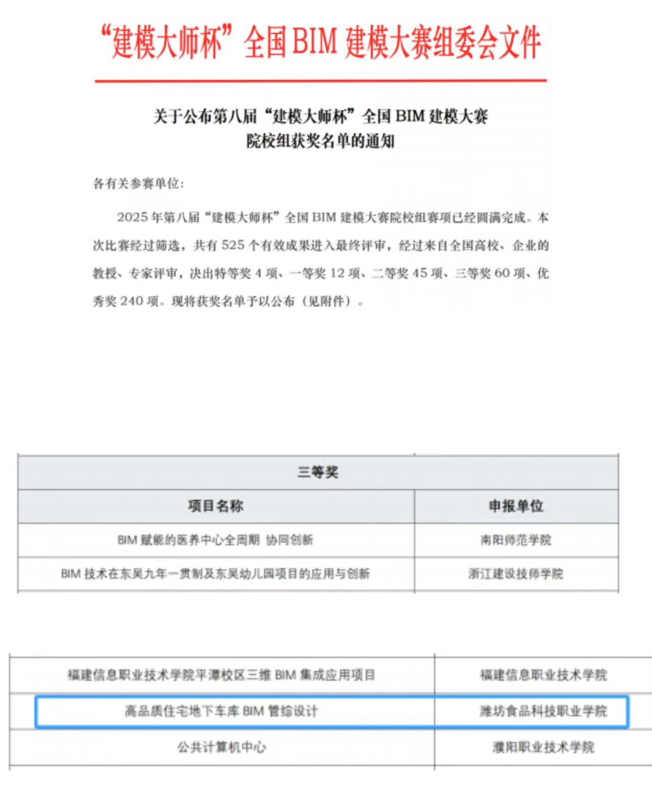 近日,第八届“建模大师杯”全国BIM建模大赛院校组圆满落幕,我校管理学院教师闫华伟、王德元指导的建筑消防技术专业学生团队(乔晨洋、张旭、孙晓婷、夏嘉琪)在比赛中表现卓越,斩获三等奖。