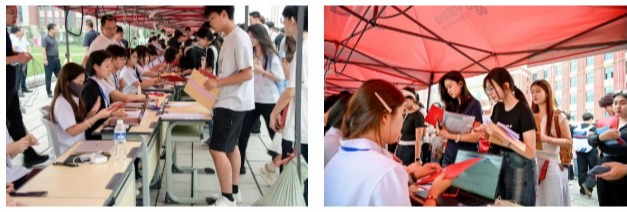 身着白色文化衫佩戴工作证的志愿服务的学长学姐们,手持彩色引导牌穿梭其间,“新生引导”“咨询服务”的字样在人群中格外显眼。看到拖着行李箱、面露迷茫的新生,他们立刻快步上前:“同学别慌,我帮你拿!先去信息审核处核验身份,再去缴费,很快就能完成报到。”亲切的话语瞬间缓解了新生的紧张感。