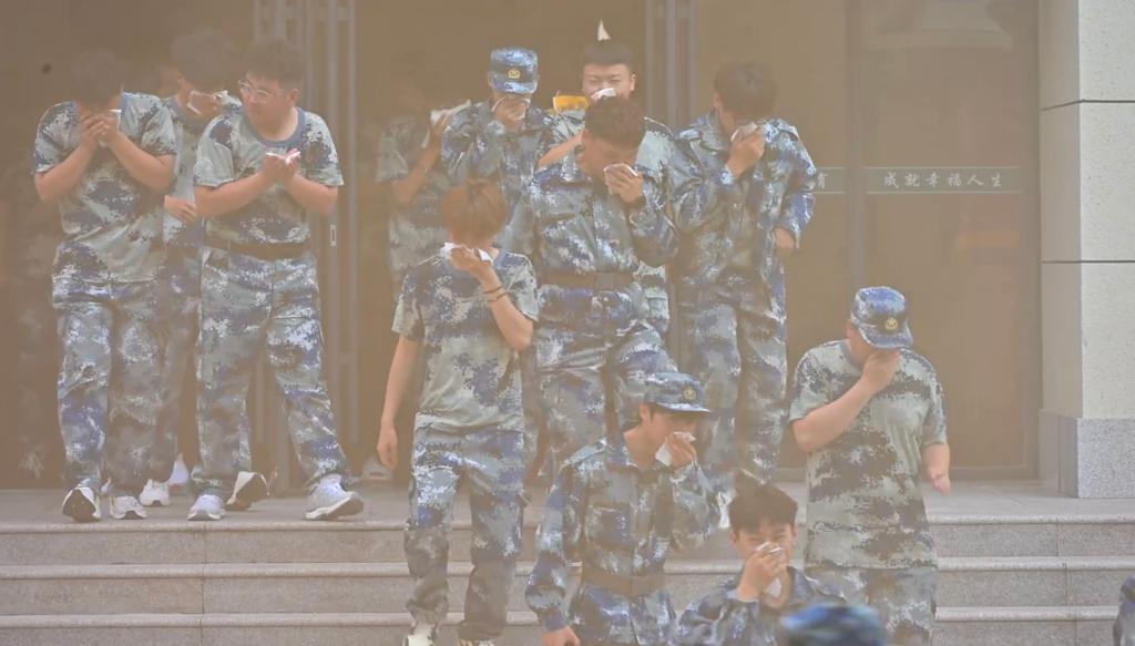随着消防警报响起,消防实战演练正式开始。在军训教官和工作人员的引导下,新生们迅速用湿毛巾捂住口鼻、弯腰低姿,按照预设的疏散路线,快速、有序地向指定的安全集合点撤离。过程中,大家不推挤、不慌乱,严格遵守“靠右行走、保持间距”的规则,短短3分钟内,全体新生便安全撤离至空旷场地。随后,辅导员清点人数,确认无“遗漏人员”。