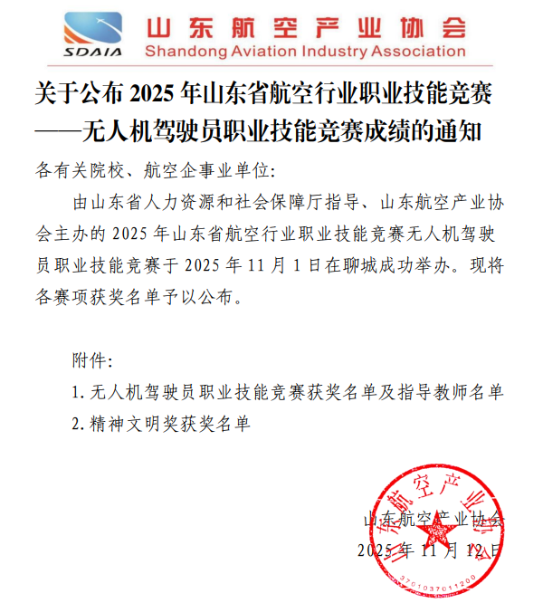 11月1日,由山东省人力资源和社会保障厅指导、山东航空产业协会主办的2025年山东省航空行业职业技能竞赛——无人机驾驶员职业技能竞赛在聊城圆满落幕。我校管理学院应急管理系选派刘立强老师和刘真恺同学参赛,师生二人分别在职工组和学生组多个赛项取得佳绩:刘立强老师荣获无人机组装调试故障排除赛职工组“三等奖”、无人机个人越障飞行任务赛职工组“优胜奖”及无人机驾驶员职工组综合成绩评定获“优胜奖”;刘真恺同学荣获无人机组装调试故障排除赛学生组“三等奖”、无人机个人越障飞行任务赛学生组“优胜奖”及无人机驾驶员学生组综合成绩评定“优胜奖”;潍坊食品科技职业学院获评“精神文明奖”。