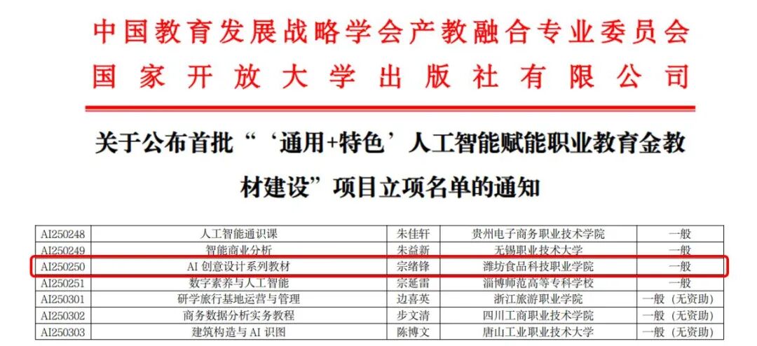 9月8日,中国教育发展战略学会产教融合专业委员会公布首批“‘通用+特色’人工智能赋能职业教育金教材建设”项目立项名单,由我校艺术传媒学院院长宗绪锋主持申报的《AI创意设计系列教材》成功获批,标志着我校在“人工智能+艺术设计”交叉领域教材建设方面取得重要突破。